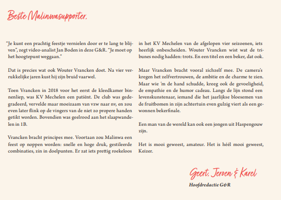 Het enige echte Malinwa supportersmagazine. Van supporters voor supporters. Een 100-tal pagina's puur leesplezier. Topinterviews, schitterende foto's, prachtige verhalen. Een echt collector's item en een must have voor elke Malinwa supporter!